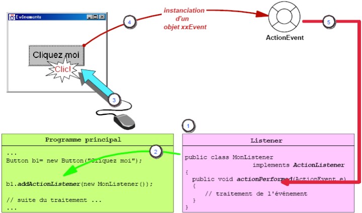 Le modèle par délégation s’appuie sur le concept de sources d’événements et de listeners (écouteurs, veilleurs, handleurs d’événements …).