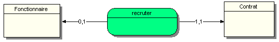 Dans une administration, on suppose qu’un CONTRAT permet de recruter un et un seul FONCTIONNAIRE, qu’un FONCTIONNAIRE peut être recruté sans contrat ou au plus par un CONTRAT.