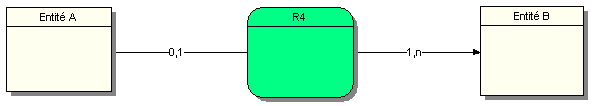 Une occurrence de l’entité A peut ne pas être associée ou être associée au maximum à une occurrence de la relation R4. Une occurrence de l’entité B est associée au minimum à une ou plusieurs occurrences de la relation R4.