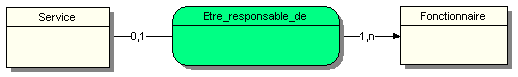 Un FONCTIONNAIRE peut être responsable de un ou plusieurs SERVICES. Un SERVICE peut n’avoir aucun ou au plus un RESPONSABLE. Il se peut que dans l’attente d’une nouvelle embauche d’un responsable, le poste ne soit plus occupé et donc n’est rattaché à aucune personne responsable.
