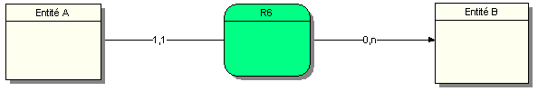 Une occurrence de l’entité A est associée à une et une seule occurrence de la relation R6. Une occurrence de l’entité B est associée à aucune ou plusieurs occurrences de la relation R6.