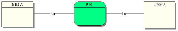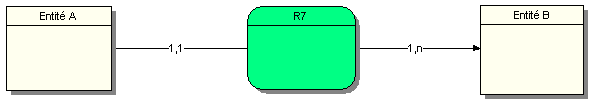 Une occurrence de l’entité A est associée à une et une seule occurrence de la relation R7. Une occurrence de l’entité B est associée au minimum à une occurrence et au maximum à plusieurs occurrences de la relation R7.