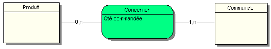 Dans cet exemple, un Produit peut être concerné par aucune ou plusieurs commandes, une Commande concerne au minimum un produit, voire plusieurs produits. En effet, pouvons-nous avoir une commande ne concernant aucun produit  Pour que l’entité commande ait du sens il lui faut au moins une association avec un produit.
