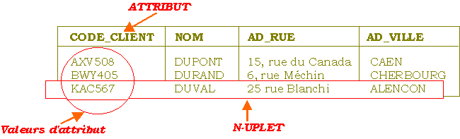 Un attribut est la colonne d’une table caractérisée par un nom. L’ordre des colonnes est sans importance. Plusieurs colonnes peuvent appartenir à un même domaine. On associe un nom à chaque colonne.