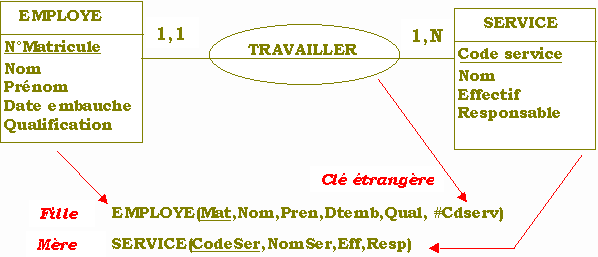 EMPLOYE ( Matricule, Nom, Prénom, Datemb,Qual, #service_id) SERVICE ( Id_service, NomSer,Effectif, Resp)