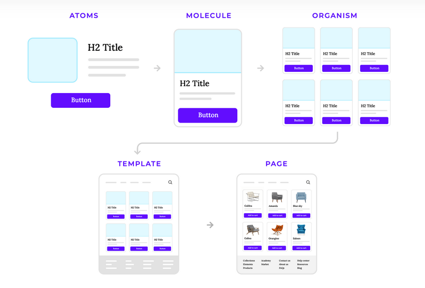 Cette méthode a été proposée par Brad Frost en 2013. Il s’agit d’une approche qui vise à améliorer la qualité du design en le rendant plus efficace et plus facile à utiliser, grâce à l’organisation des éléments graphiques en différents niveaux de complexité. Ces derniers sont conçus pour être scalables, réutilisables* et modulaires, pouvant être combinés pour construire des sections plus grandes.
