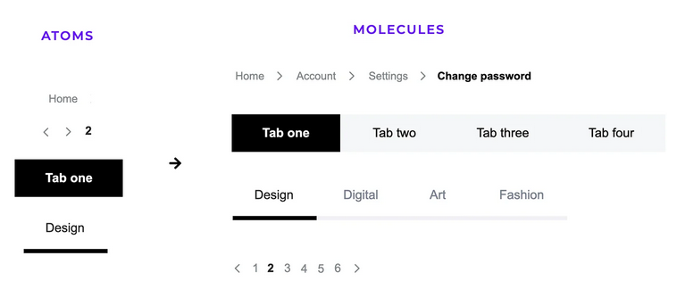 (Atomes → Molécules → Organismes → Templates → Pages)