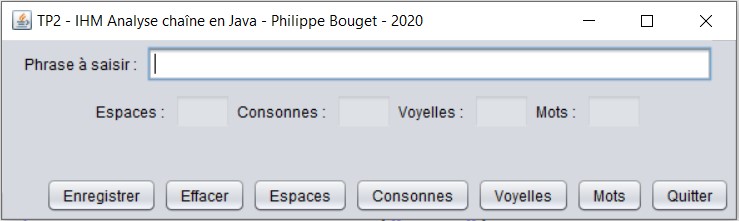 Objectifs : Construire une interface graphique et utiliser la classe Chaine (ou AnalyseChaine) précédemment créee. Mise en place des composants graphiques et des écouteurs pour la gestion des événements.