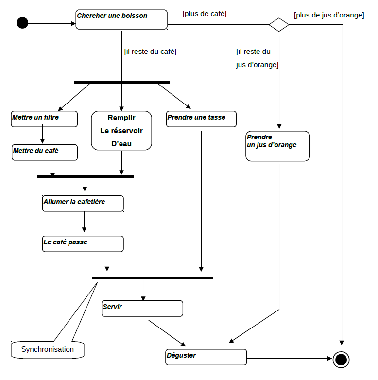Il sont plutôt rattachés à une opération ou un cas d’utilisation qu’à une classe. Utilisés pour décrire l’algorithmique d’une opération : séquences d’étapes avec représentation de décisions et de la synchronisation des flots de contrôles. Focalisés sur les traitements internes et non pas sur la réception d’événements externes.