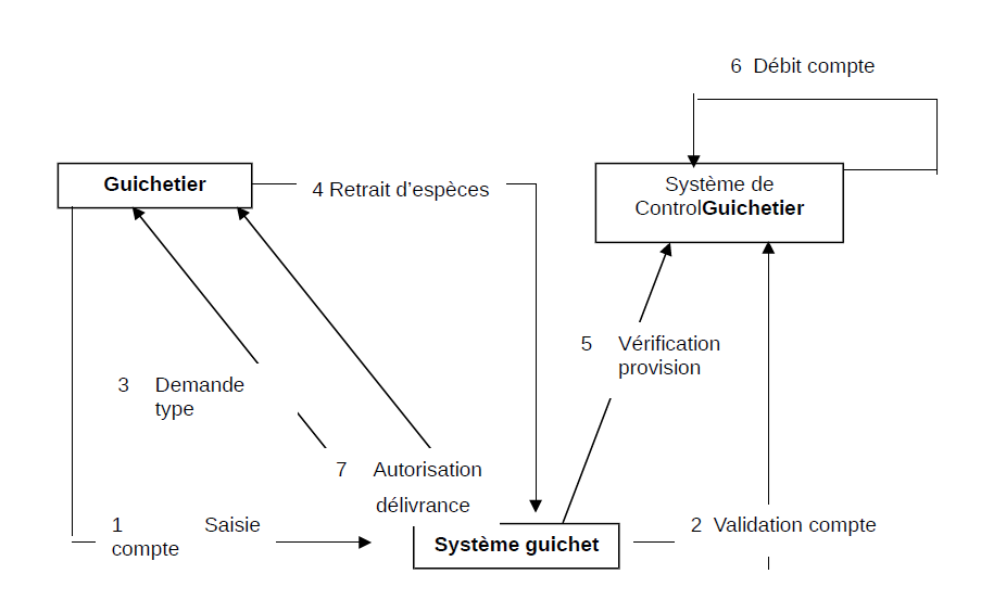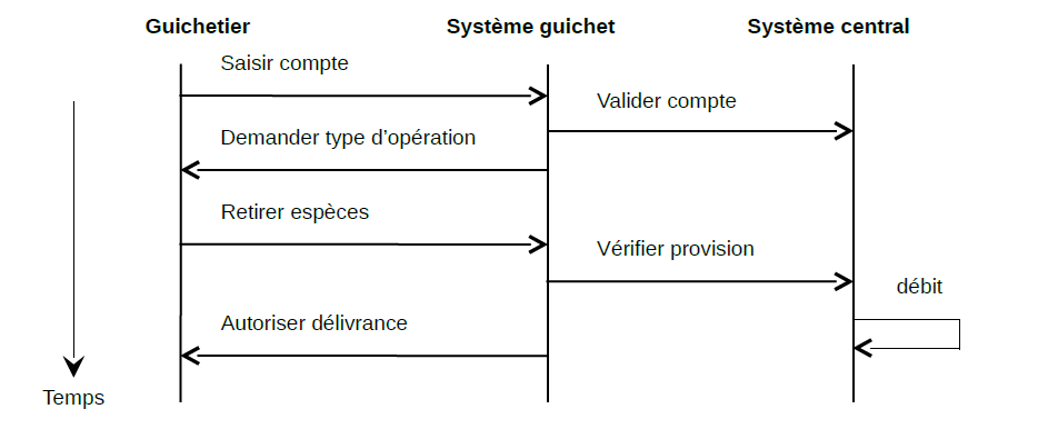 Remarque : A priori on construit le scénario de base sans tenir compte des exceptions (erreurs, absence de réponse quand le temps prévu est dépassé).