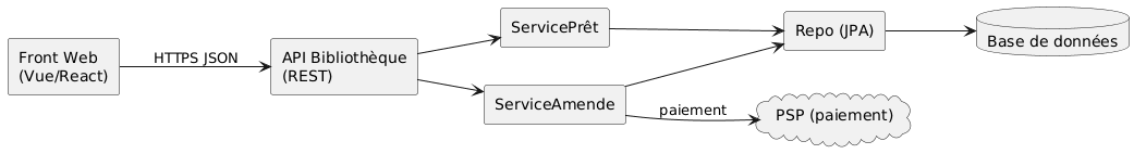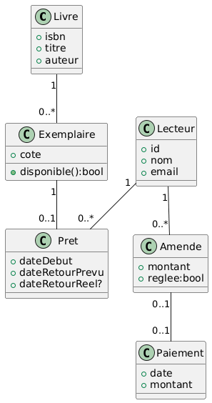 public Pret emprunter(Long lecteurId, Long exemplaireId) { Exemplaire exemplaire = exRepo.findById(exemplaireId).orElseThrow(); if (!exemplaire.estDisponible()) throw new IllegalStateException("Indisponible"); Pret pret = new Pret(lecteurId, exemplaireId, today(), today().plusDays(21)); pretRepo.save(pret); exemplaire.marquerIndisponible(); exRepo.save(exemplaire); return pret; }