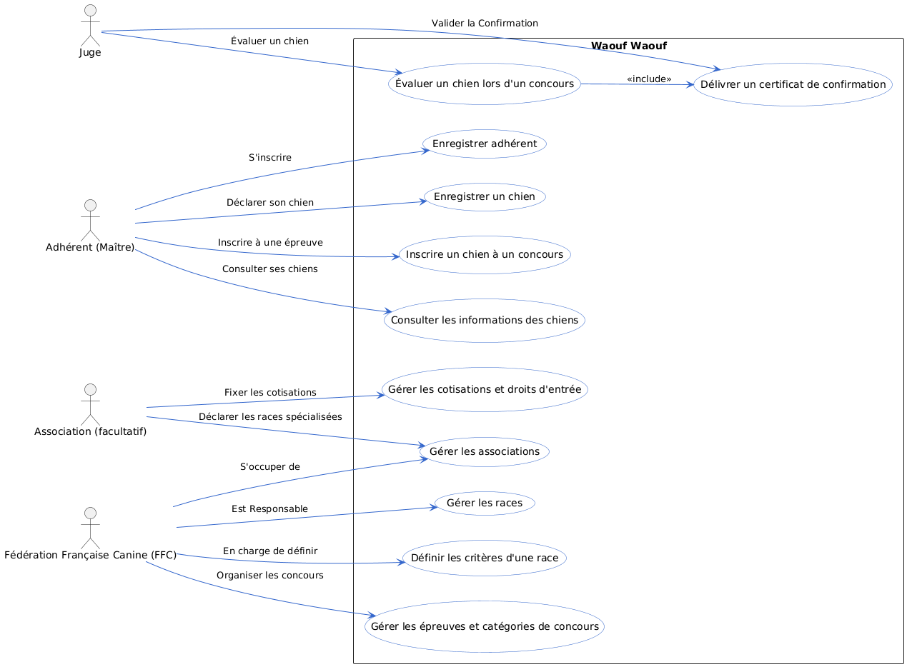 @startuml left to right direction skinparam packageStyle rectangle skinparam usecase { BackgroundColor #f9f9f9 BorderColor #3366cc ArrowColor #3366cc } actor "Adhérent (Maître)" as Adherent actor "Association (facultatif)" as Association actor "Fédération Française Canine (FFC)" as FFC actor "Juge" as Juge rectangle "Waouf Waouf" { (Enregistrer adhérent) as UseCase1 (Gérer les associations) as UseCase2 (Enregistrer un chien) as UseCase3 (Définir les critères d'une race) as UseCase4 (Gérer les cotisations et droits d'entrée) as UseCase5 (Inscrire un chien à un concours) as UseCase6 (Évaluer un chien lors d'un concours) as UseCase7 (Délivrer un certificat de confirmation) as UseCase8 (Consulter les informations des chiens) as UseCase9 (Gérer les épreuves et catégories de concours) as UseCase10 (Gérer les races) as UseCase11 UseCase7 --> UseCase8 : <<include>> } '=== Relations entre acteurs et cas === Adherent --> UseCase1 : "S'inscrire" Adherent --> UseCase3 : "Déclarer son chien" Adherent --> UseCase6 : "Inscrire à une épreuve" Adherent --> UseCase9 : "Consulter ses chiens" Association --> UseCase2 : "Déclarer les races spécialisées" Association --> UseCase5 : "Fixer les cotisations" Juge --> UseCase7 : "Évaluer un chien" Juge --> UseCase8 : "Valider la Confirmation" FFC --> UseCase2 : "S'occuper de" FFC --> UseCase10 : "Organiser les concours" FFC --> UseCase4 : "En charge de définir" FFC --> UseCase11: "Est Responsable" @enduml
