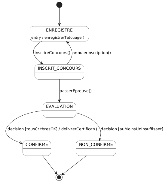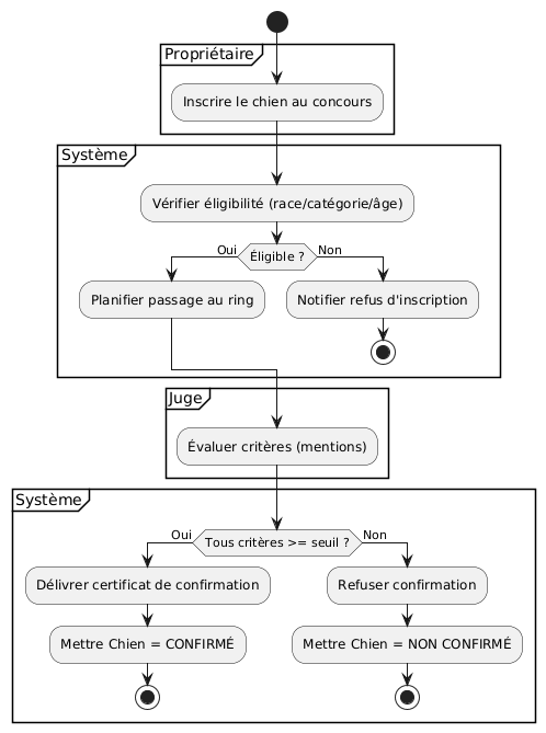 8) Construire le diagramme d’États-transitions du Cycle de vie d’un Chien (Enregistré puis Inscrit au concours puis Évaluation puis Confirmé/Non confirmé)