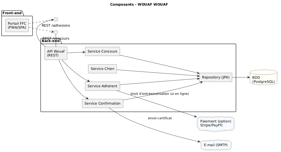 9) Diagramme de Composants (Optionnel) : Architecture logique (Front, API, Services : Adhérent/Chien/Concours/Confirmation, Repo, Paiement, Email)